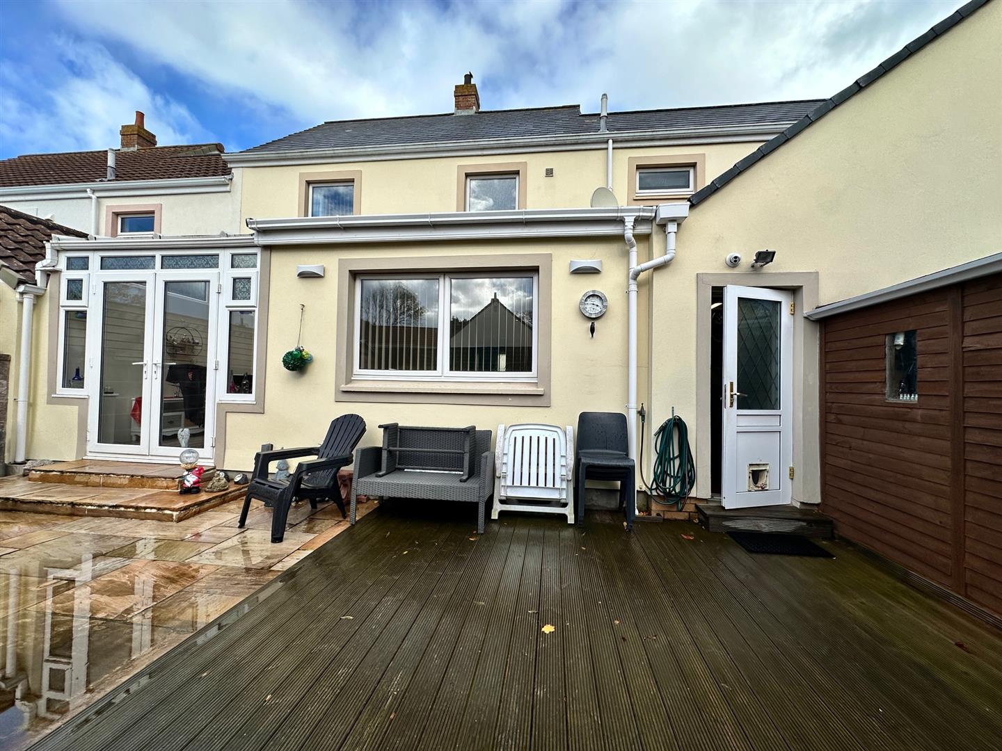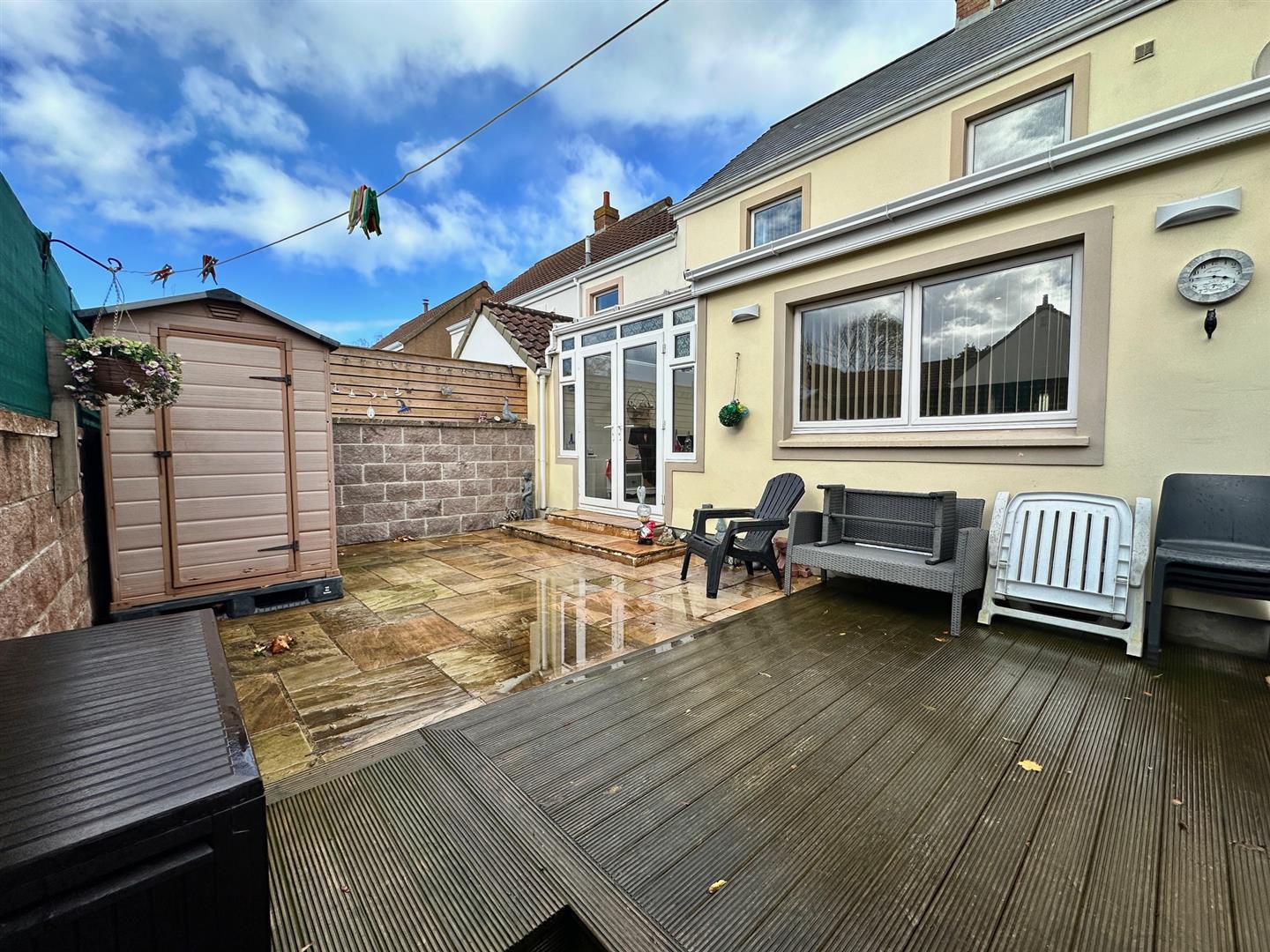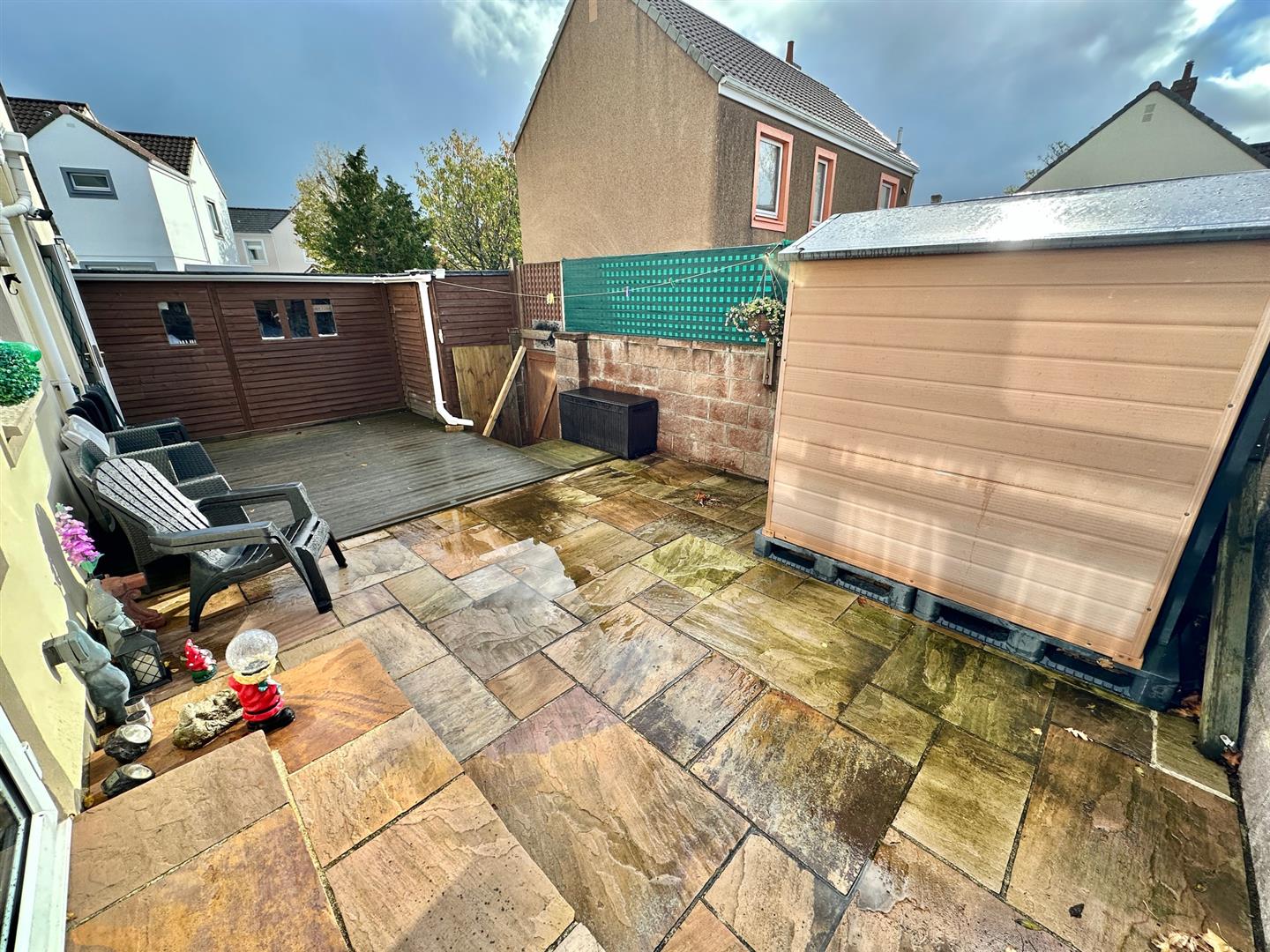 South facing rear garden laid to paving and decking. Plenty of storage sheds which can be removed to make more garden space. Handy rear gate opening on to rear pathway.