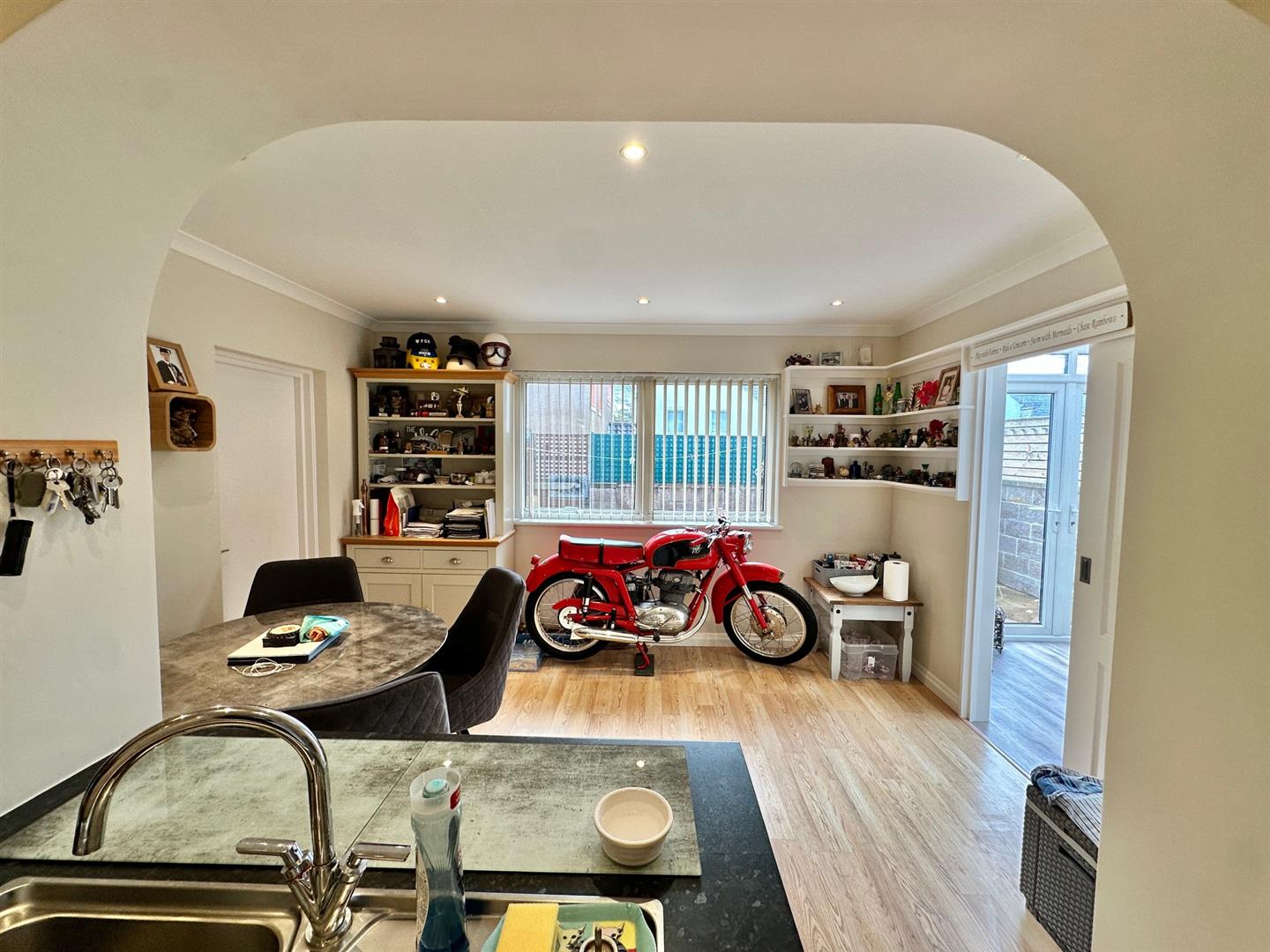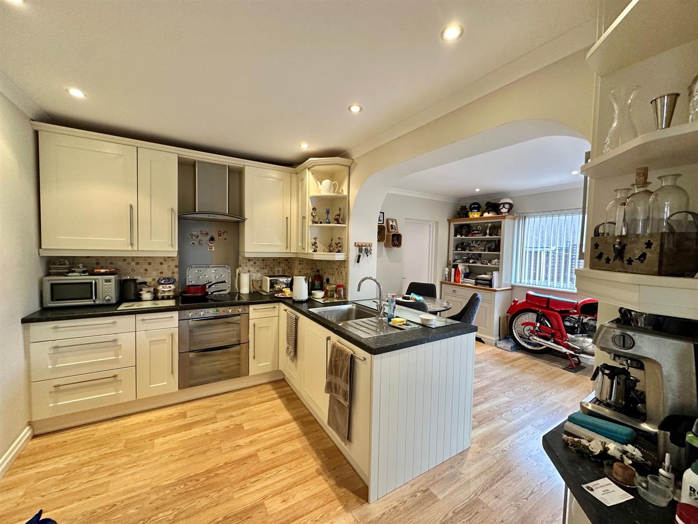 Light & airy great sized kitchen diner with a range of high and low cream kitchen units, laminate worktops, tiled splashbacks and integrated double oven with hobs & extractor over, integrated fridge / freezer, dish washer & stainless steel sink & drainer. There are doors to the lounge, conservatory, integral garage & large window overlooking the rear garden.