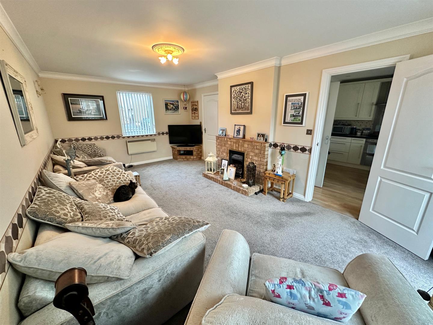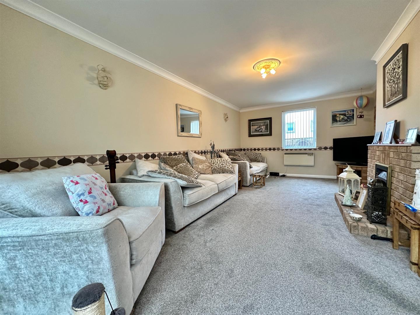 Spacious dual aspect lounge laid to carpet with feature functional fireplace and doors opening on to the conservatory and door into the entrance hall.