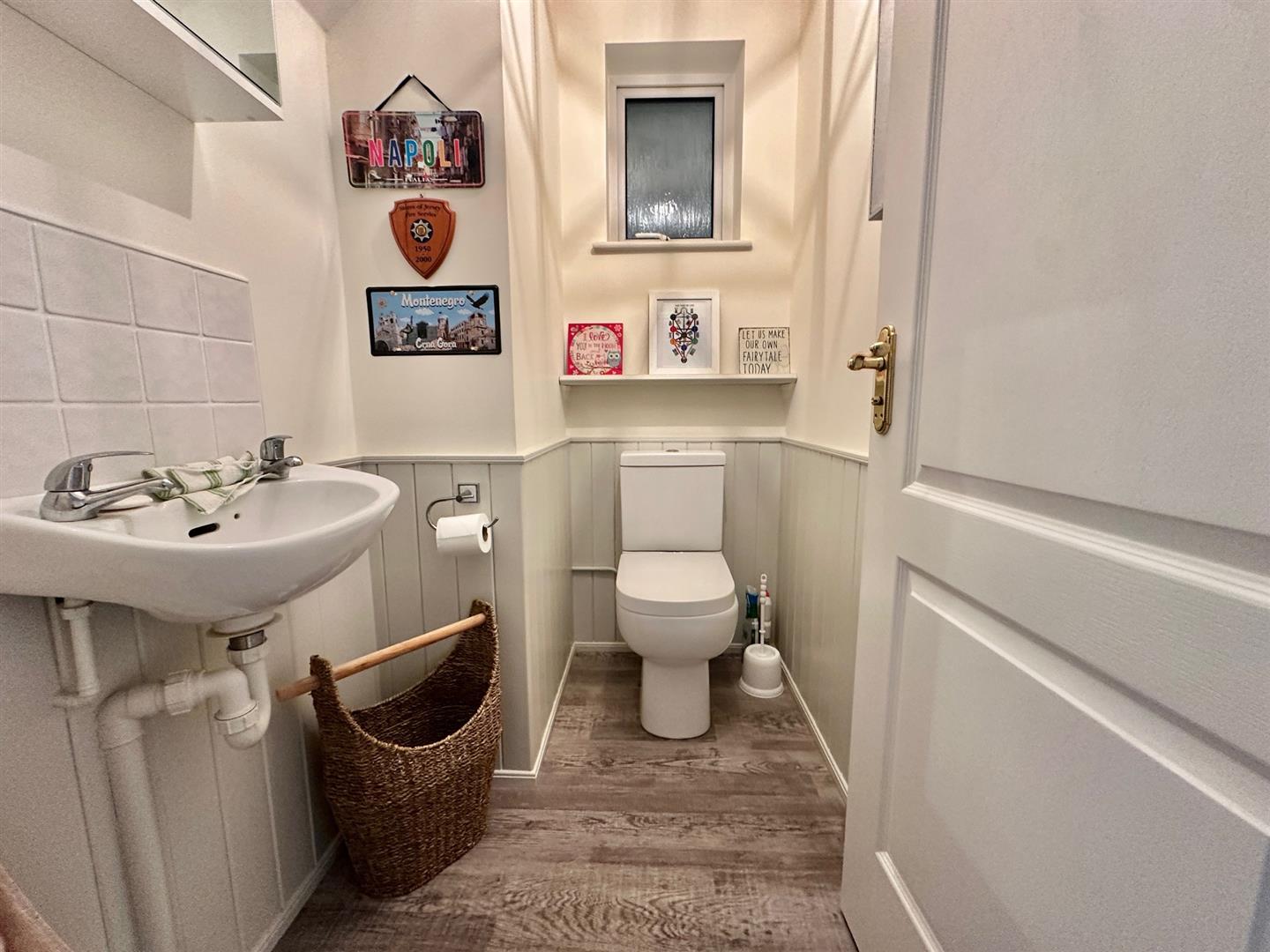 Handy cloakroom with WC, wash hand basin & mirrored cupboard.