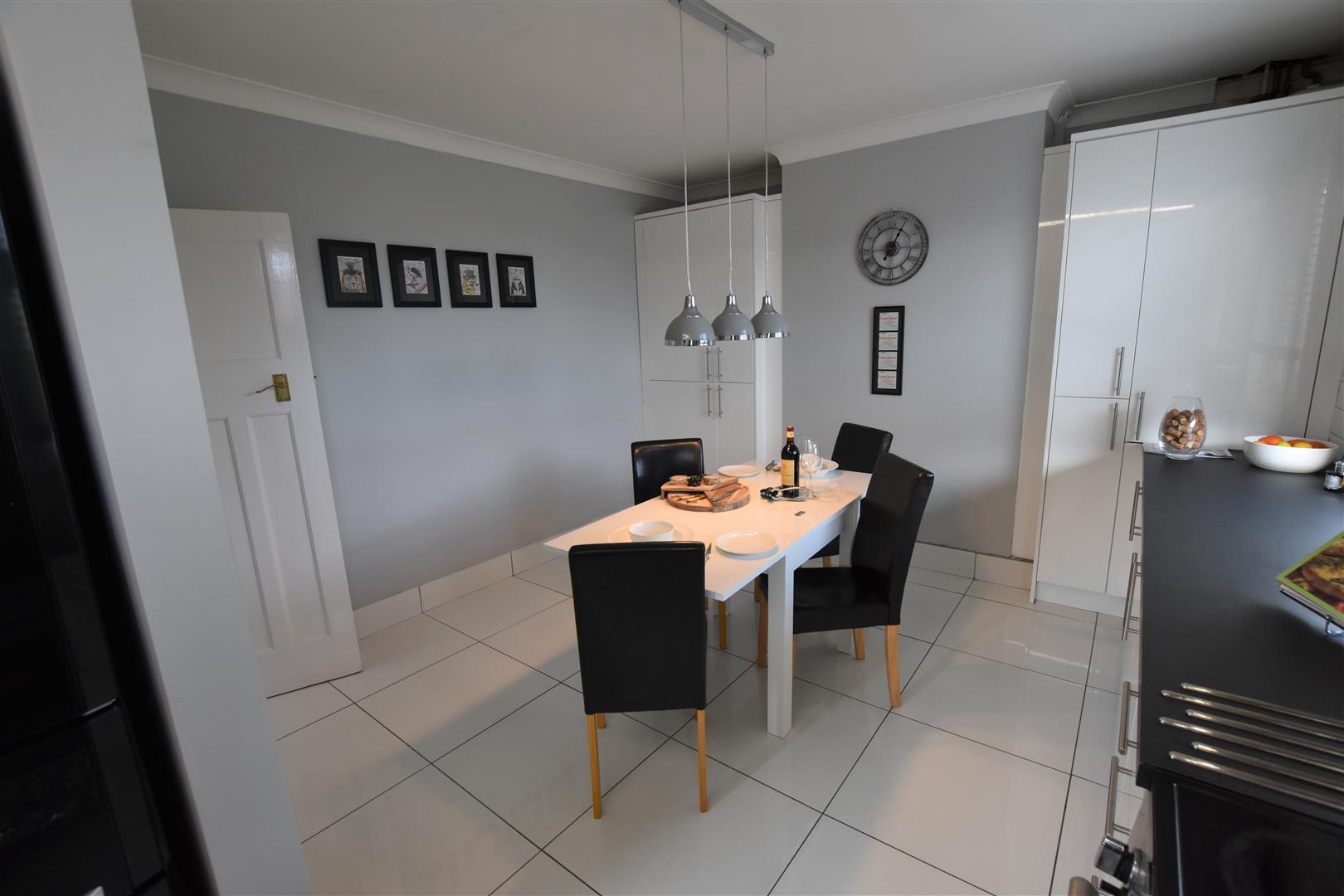 Great sized eat-in kitchen with a range of high white gloss units and charcoal work surfaces. Range cooker, integrated dishwasher and standalone fridge / freezer. Handy under stair storage cupboard. Tiled floor, 2 large windows and door to garden.