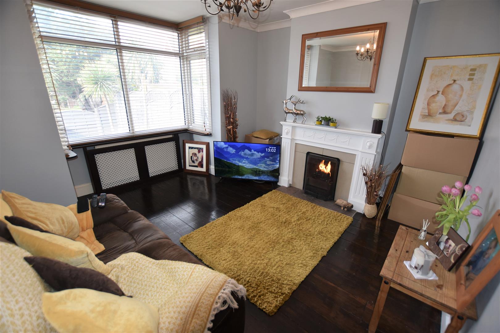 Good sized west facing lounge with bay window, functional fireplace and wooden flooring.