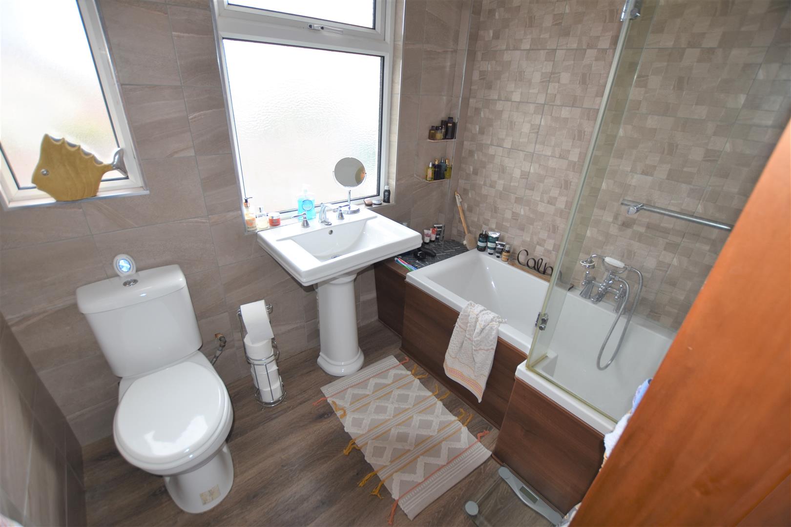 Fully tiled walls & floor. Bath with shower screen, Wash hand basin, WC & heated towel rail. 2 x frosted windows.