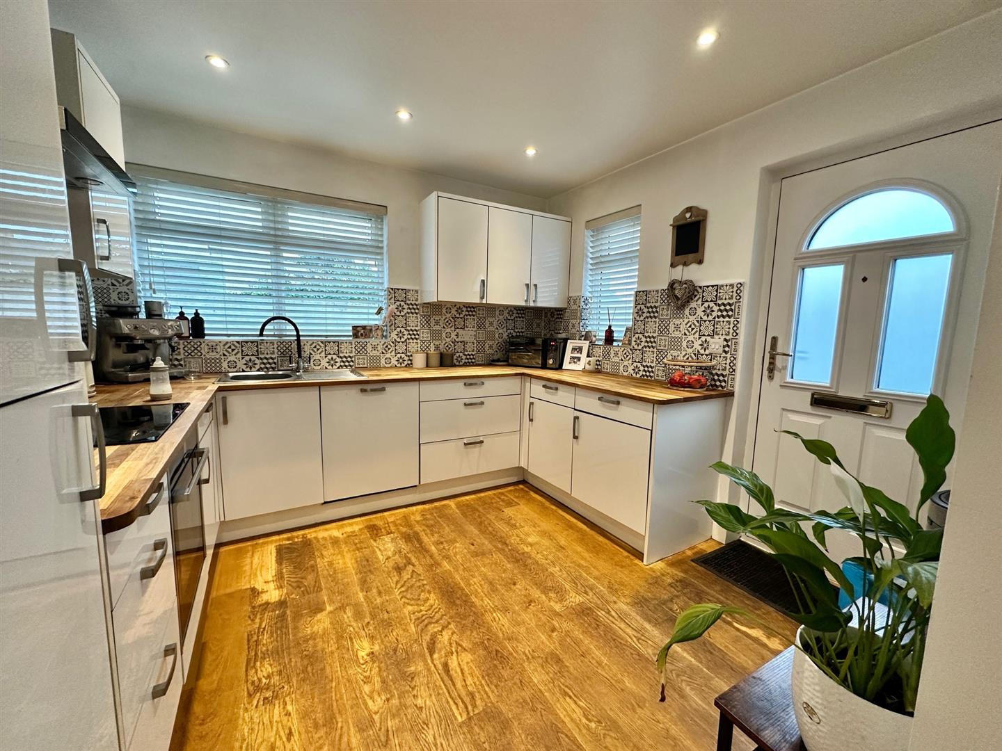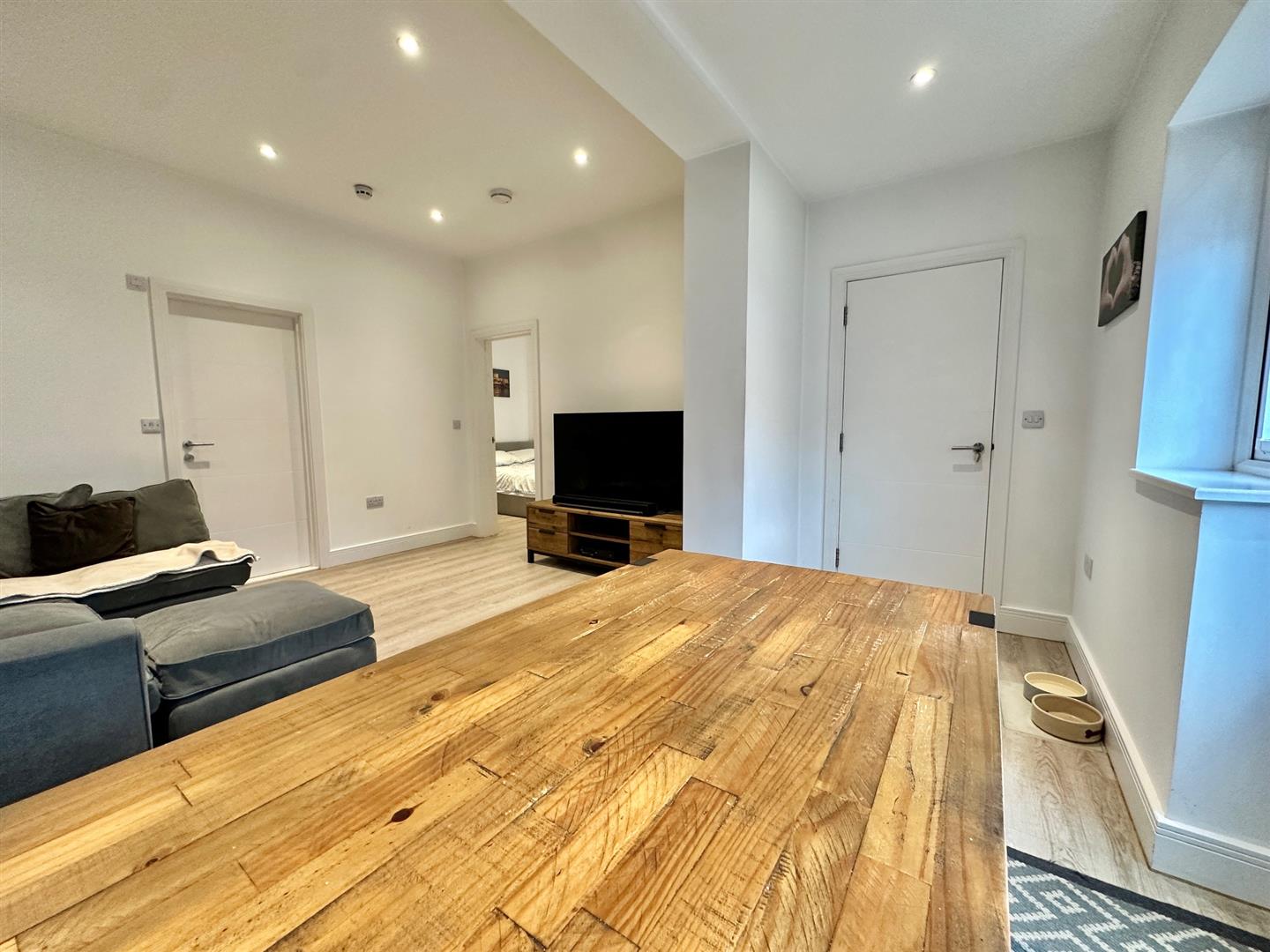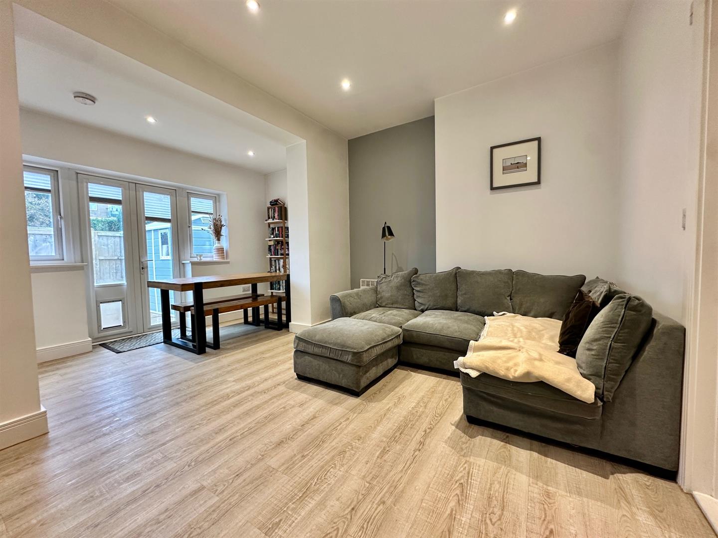 Spacious lounge / diner with wood effect flooring and double doors opening on to the safe & enclosed low maintenance paved garden. Recessed lighting.