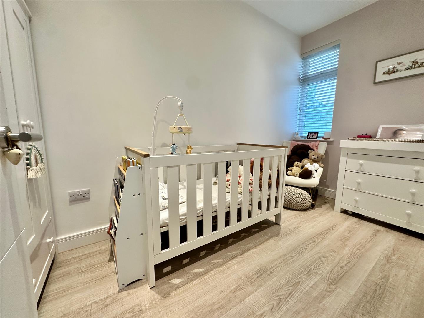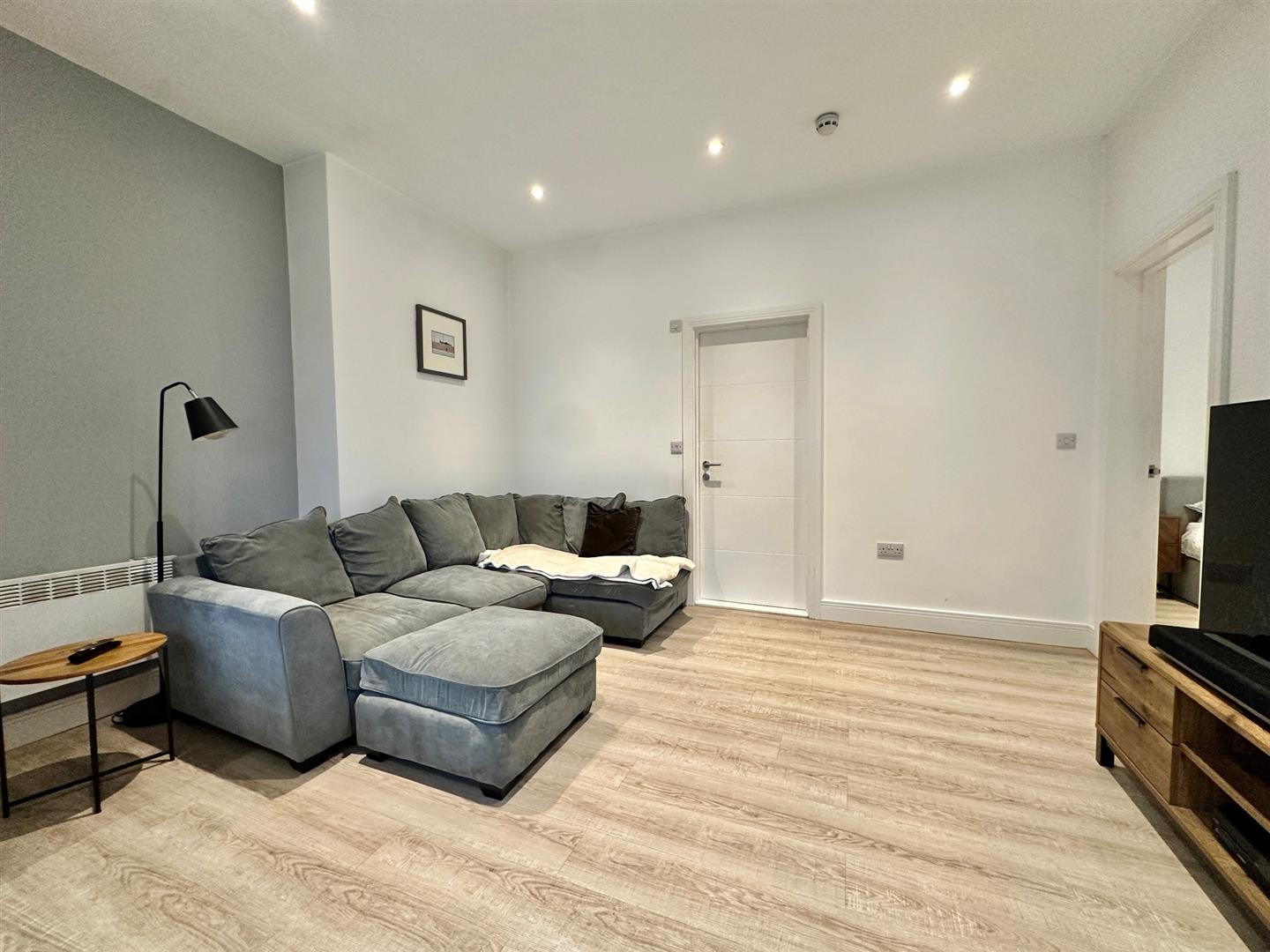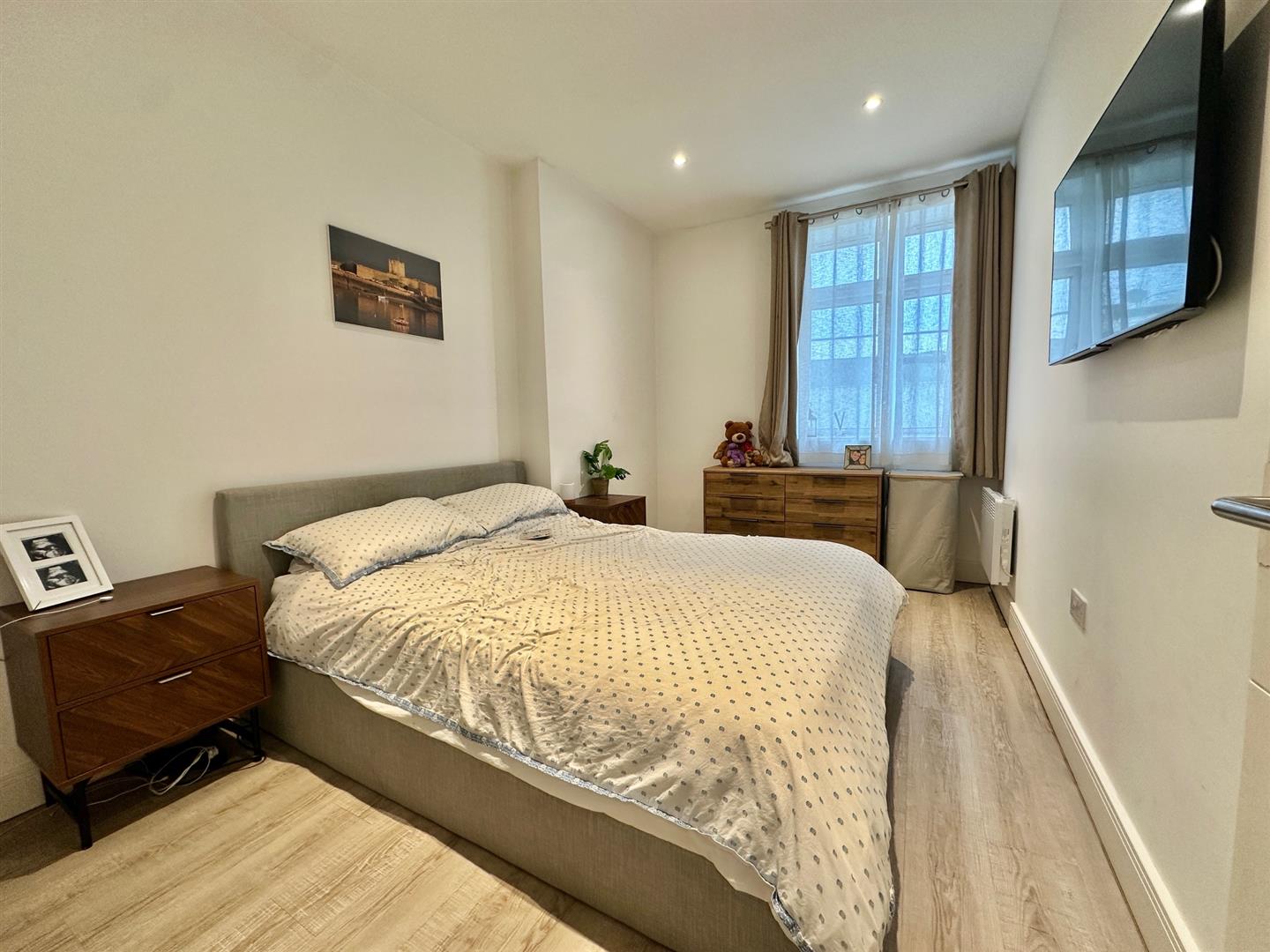 Large single bedroom with wood effect flooring & recessed lighting.