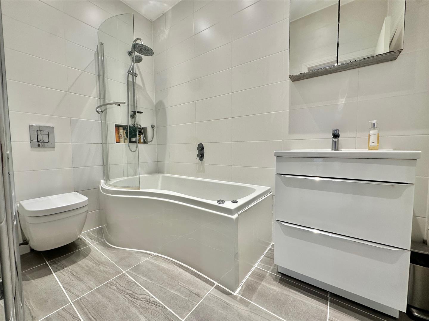 Fully tiled walls and floor. Bath with shower over and screen, wall hung WC, wash hand basin with cupboards below and mirrored cupboard above & heated towel rail. The great sized utility cupboard is also located in the bathroom.