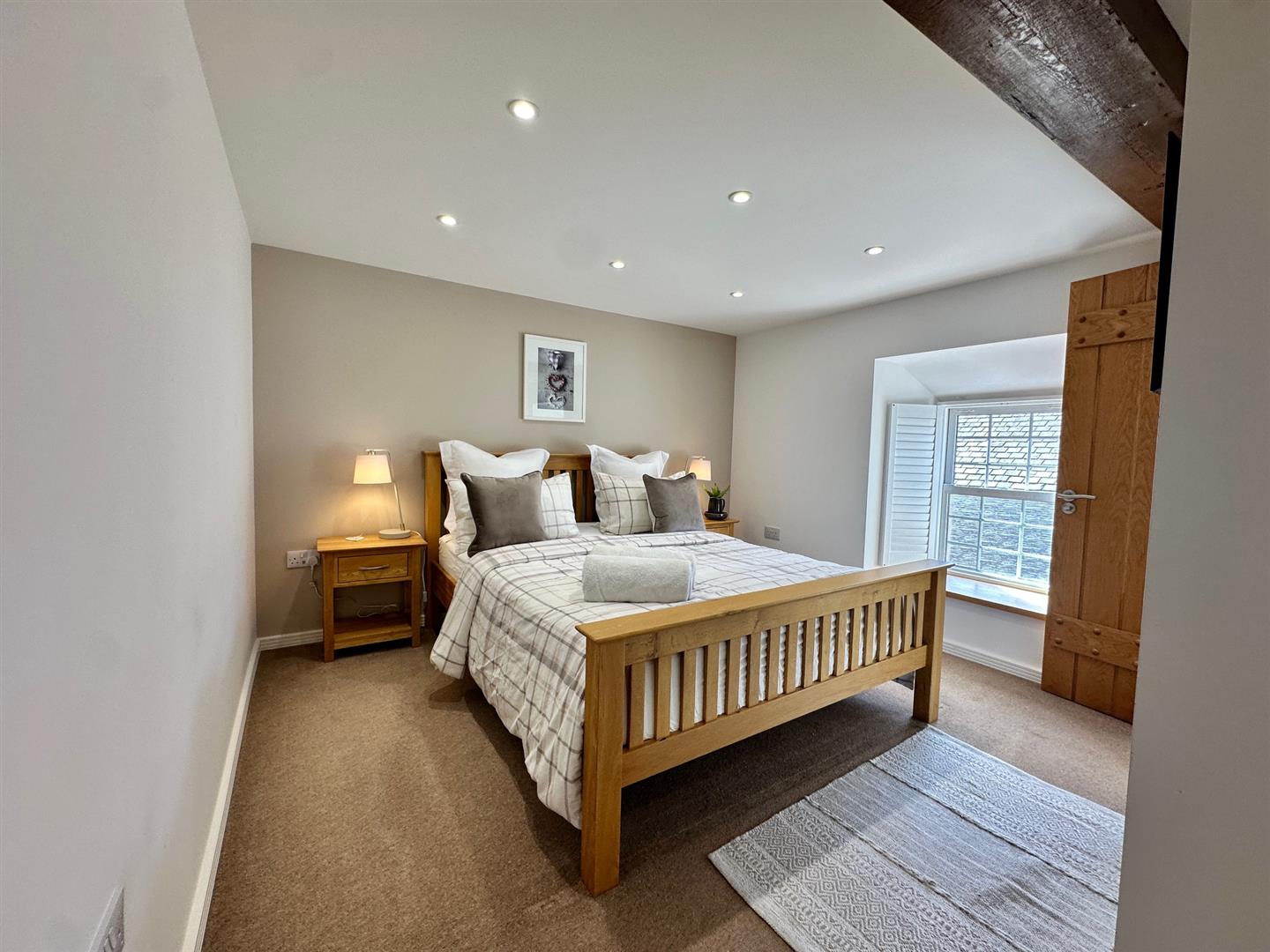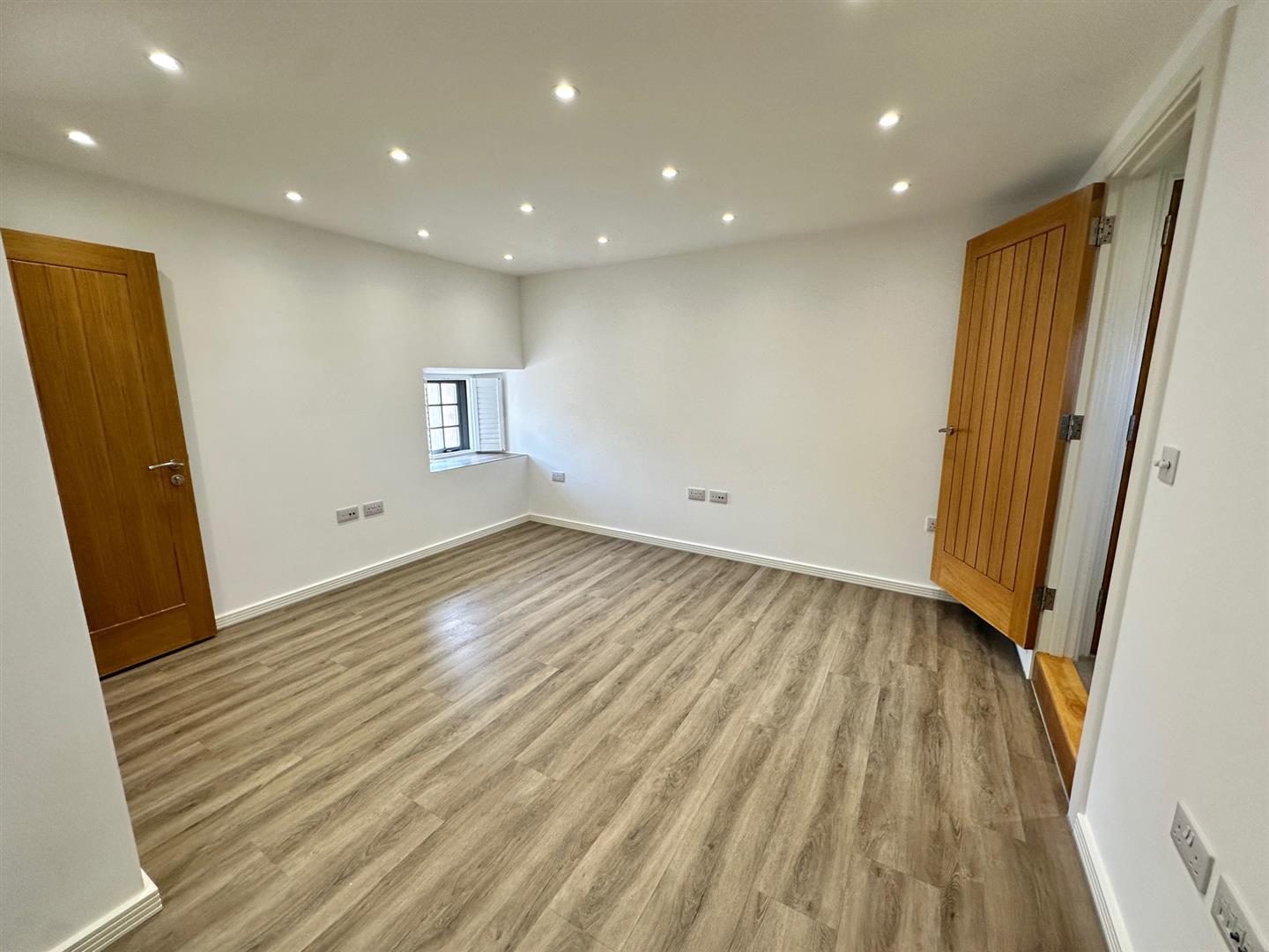 Double bedroom laid to carpet with original wooden beam, window overlooking courtyard & doors to walk-in wardrobe and en-suite shower room. Recessed lighting.
