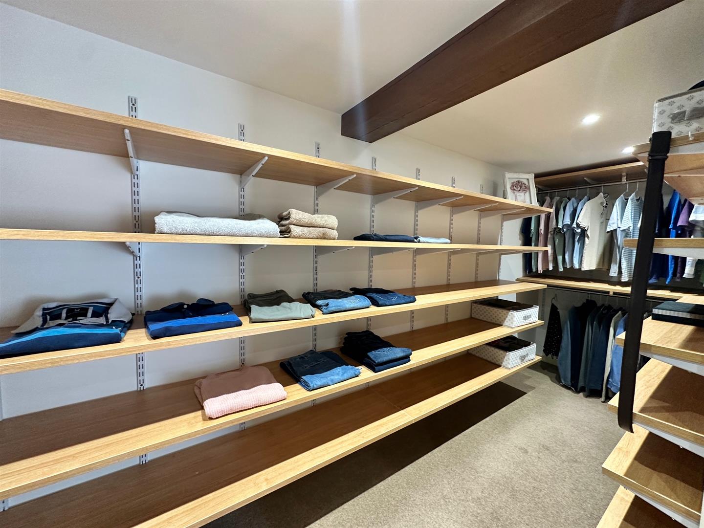 Fully kitted out walk-in wardrobe laid to carpet. Recessed lighting.