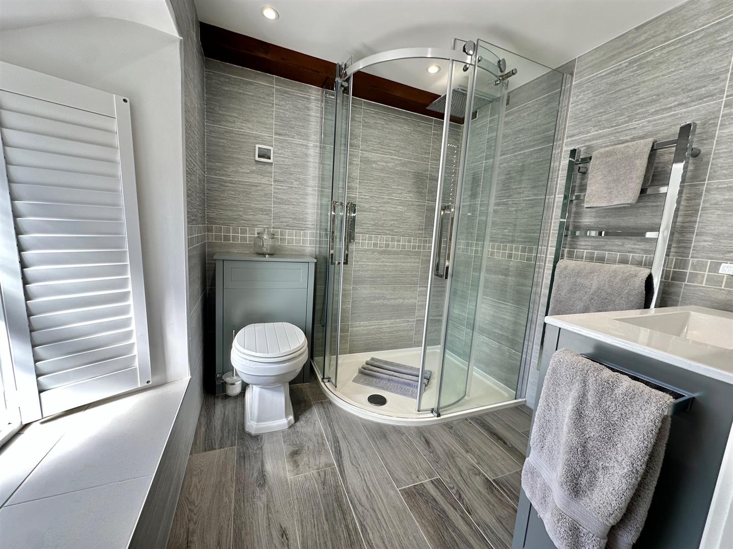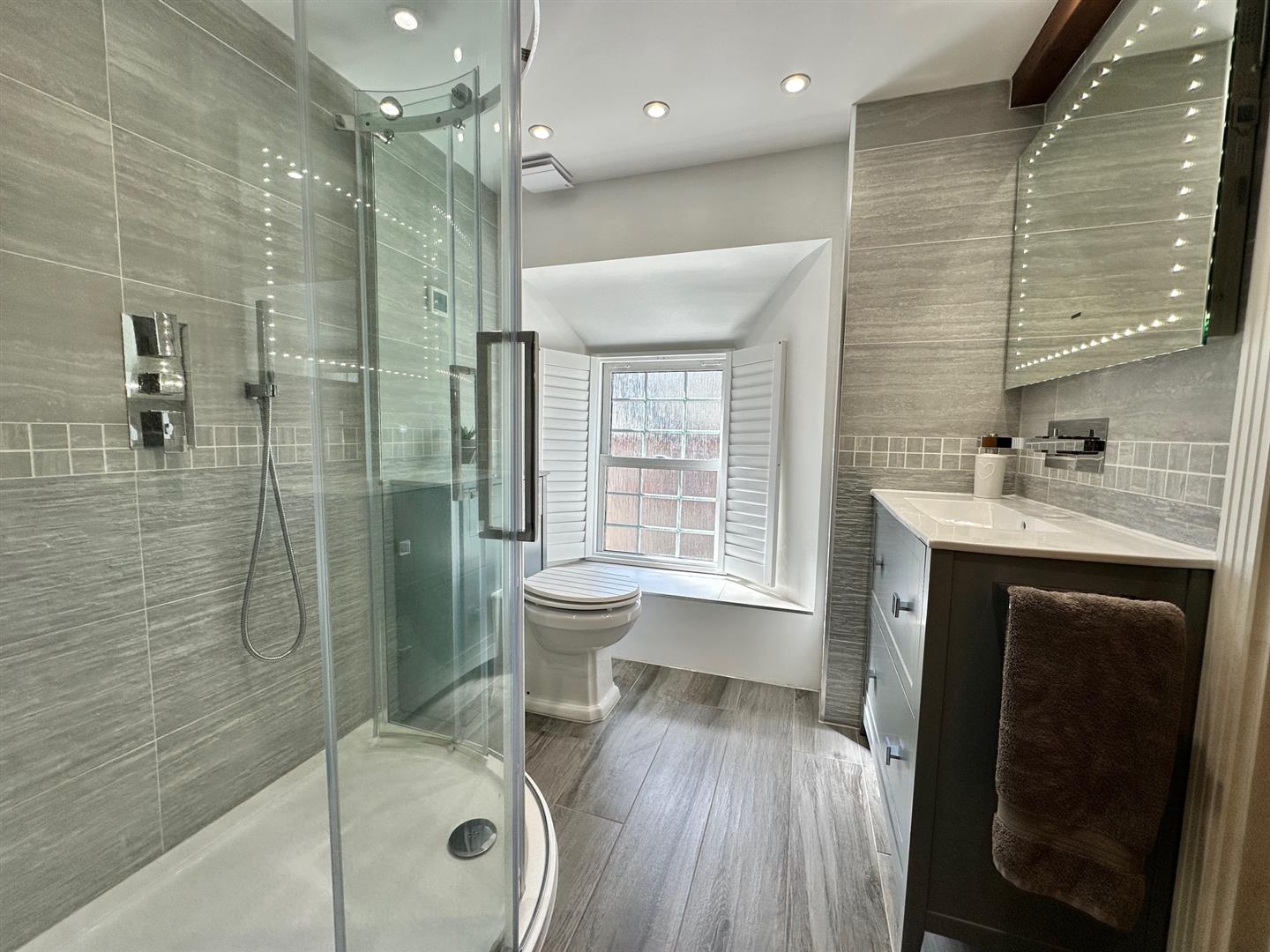 Fully tiled walls & floor. Shower & enclosure, WC, wash hand basin with cupboards below and heated & lit mirror above & heated towel rail. Frosted window & recessed lighting.