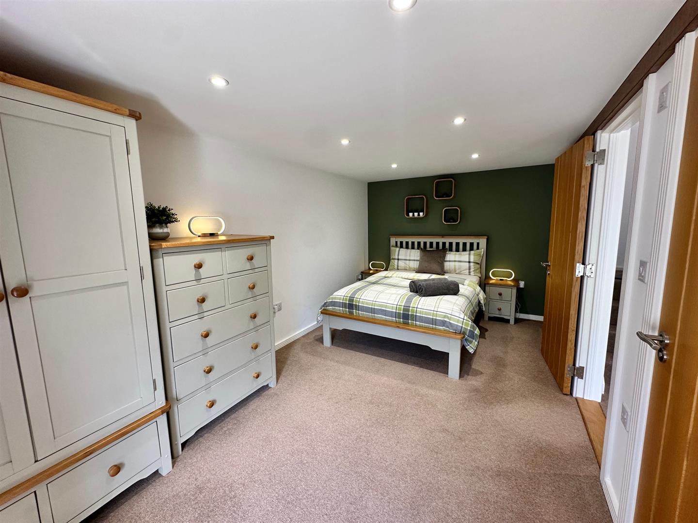 Double bedroom laid to carpet with window overlooking courtyard & door to ‘Jack & Jill’ house shower room. Recessed lighting.