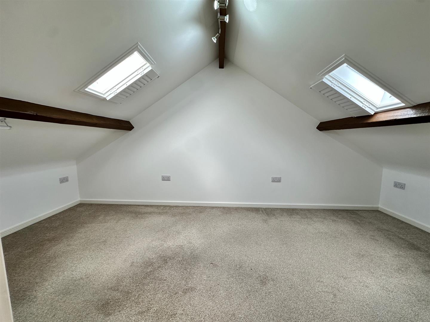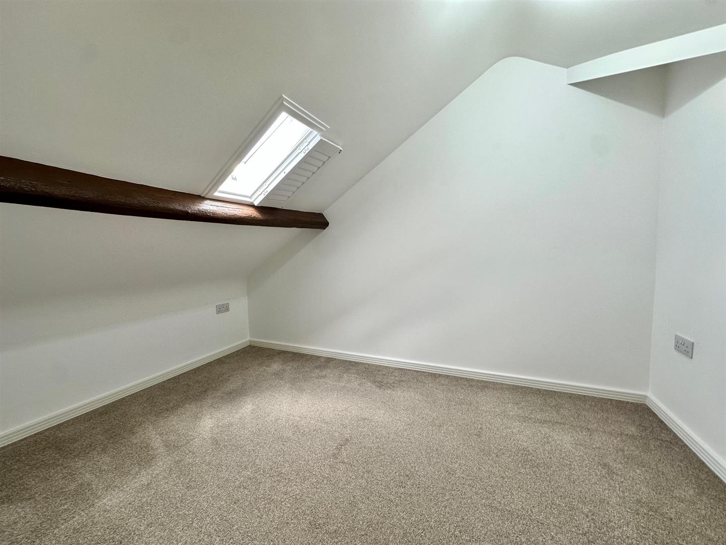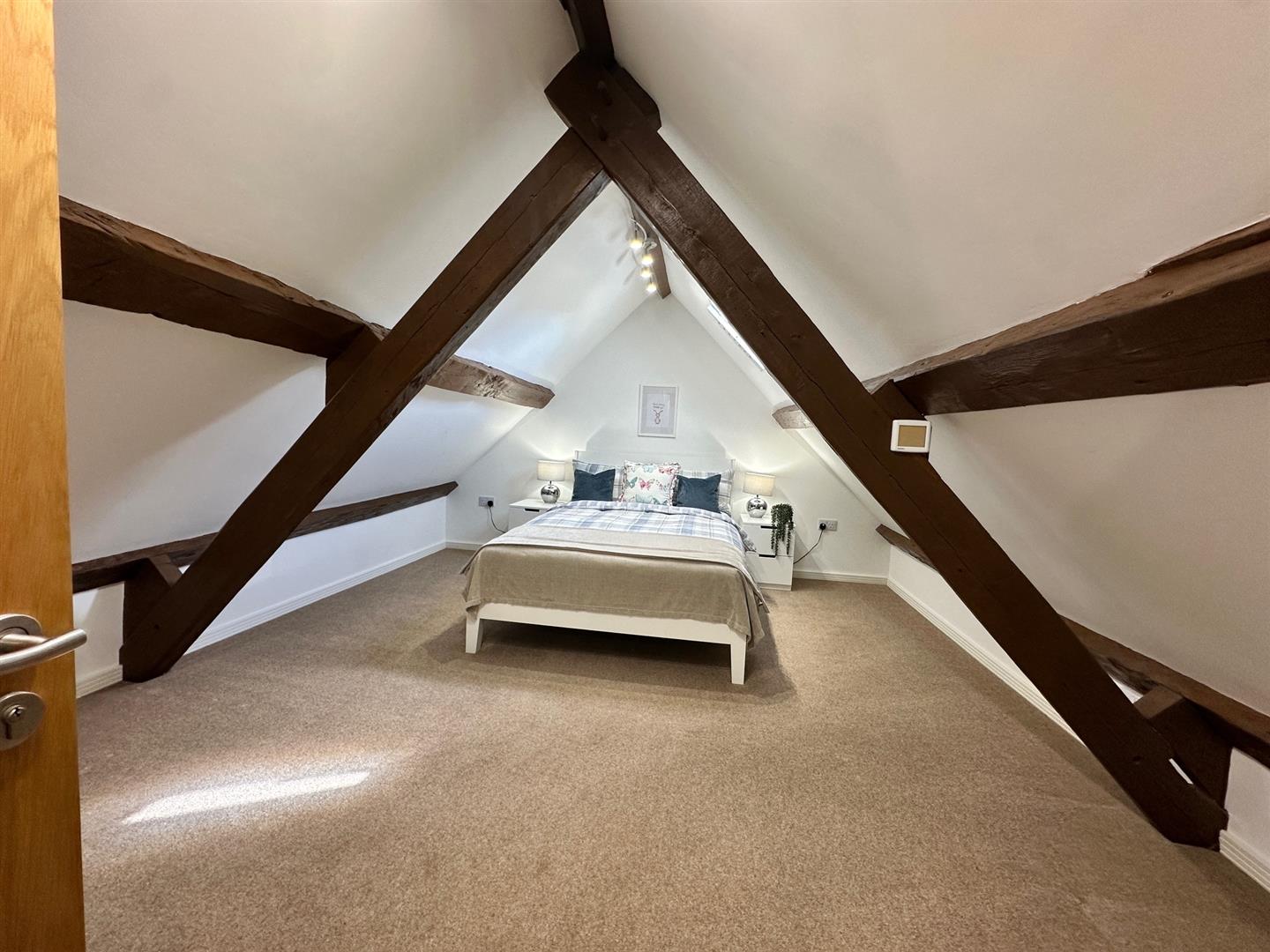 Small double bedroom laid to carpet with original rooflights & feature wooden beams.