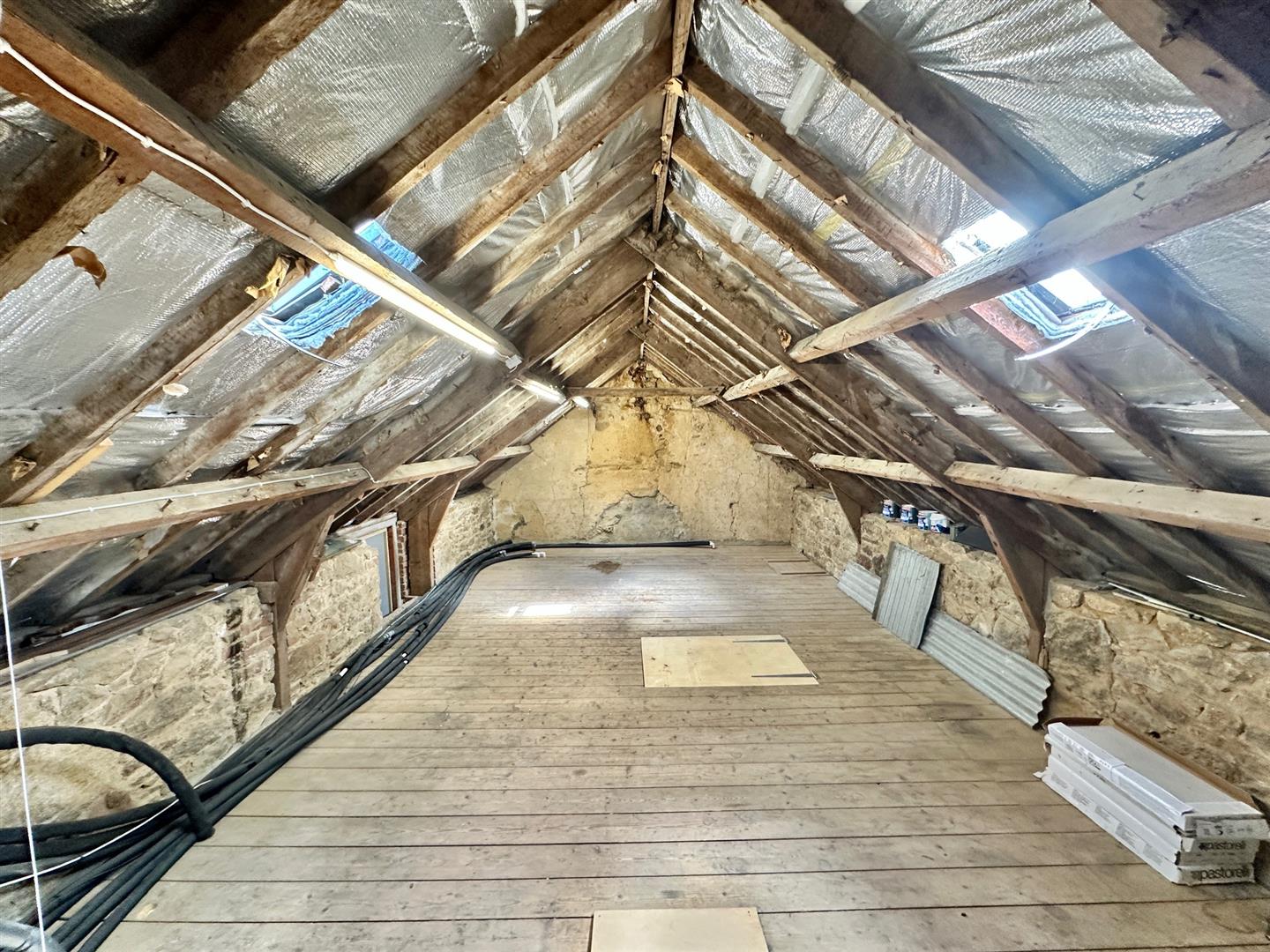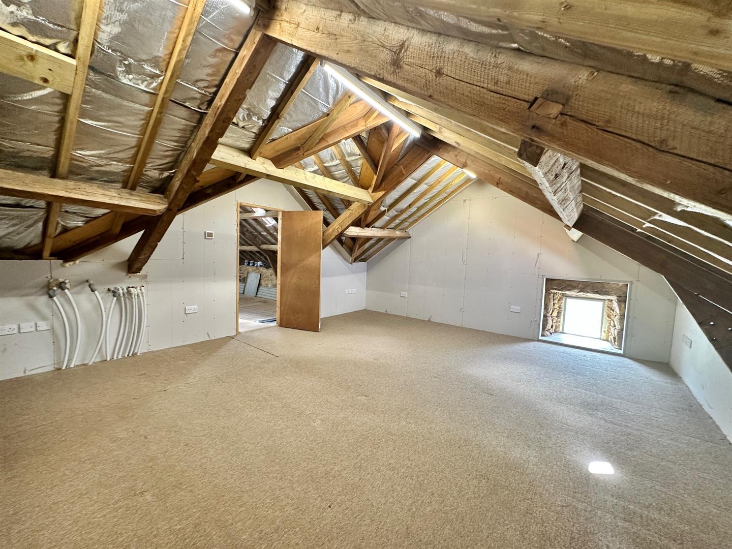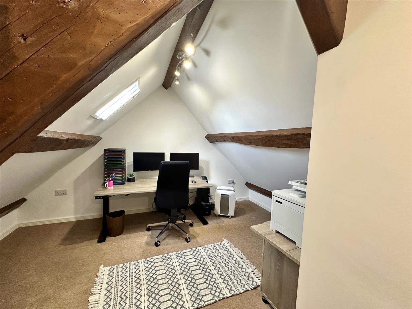 Large single bedroom laid to carpet with original roof lights & feature wooden beams.