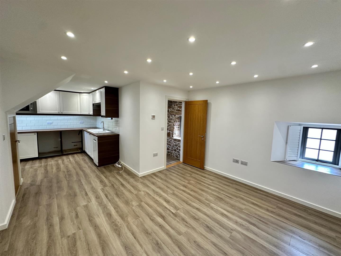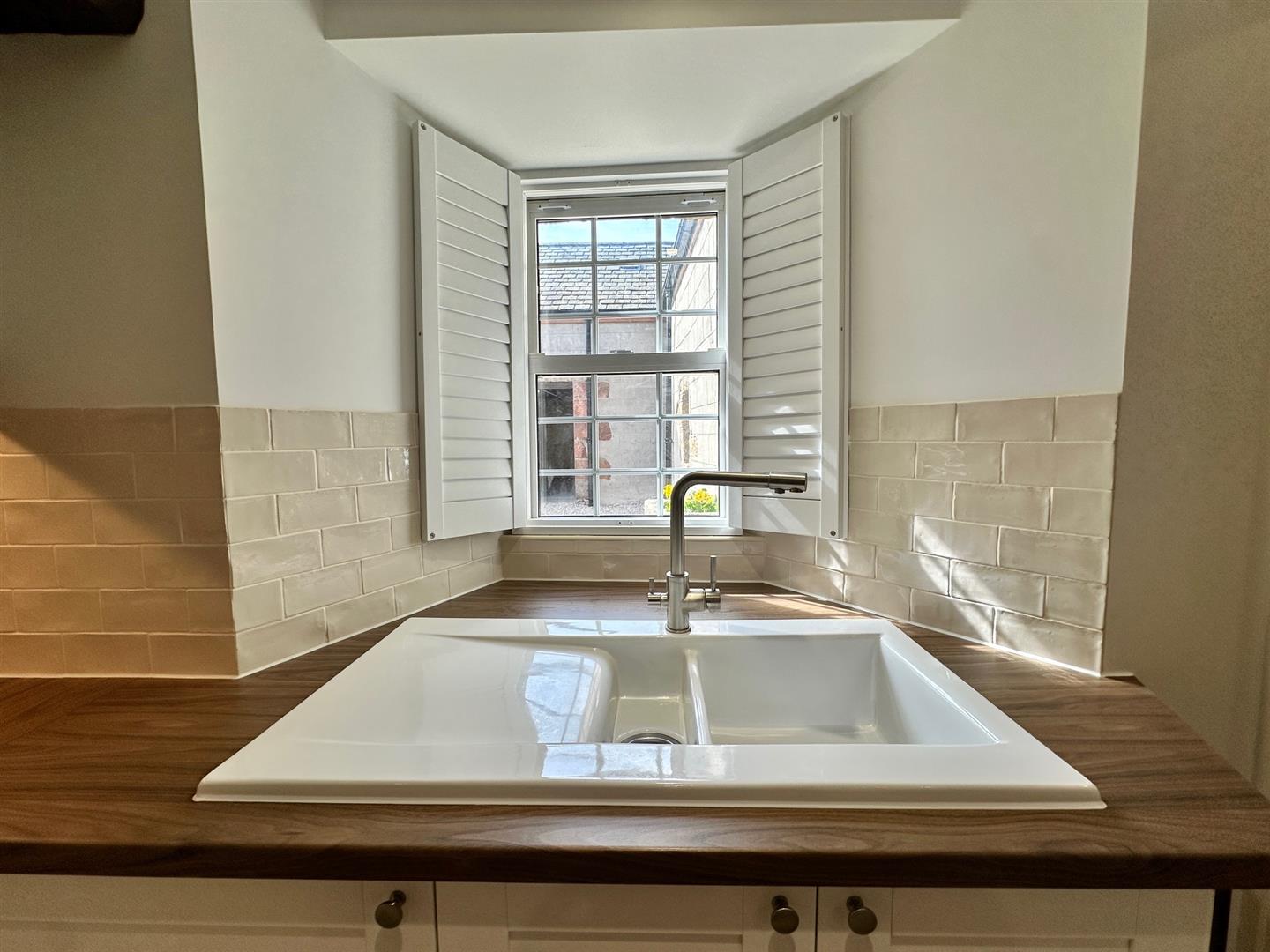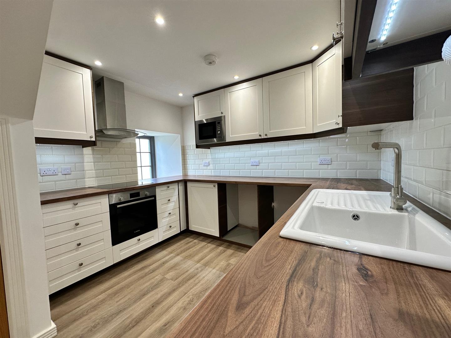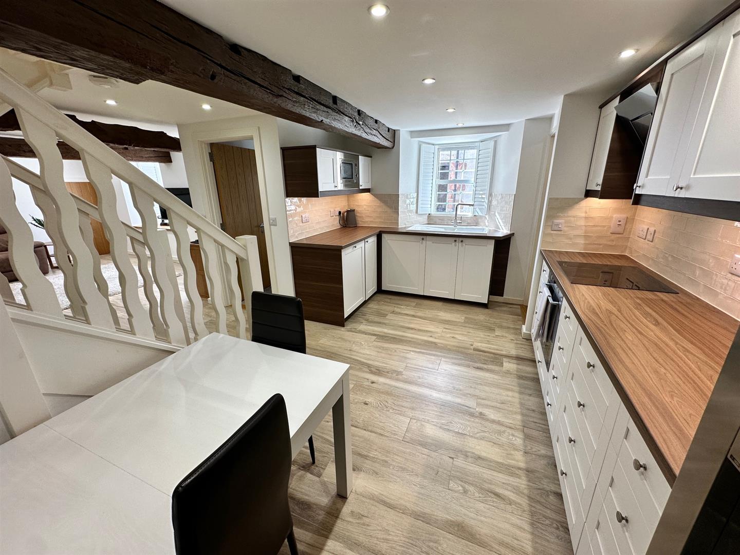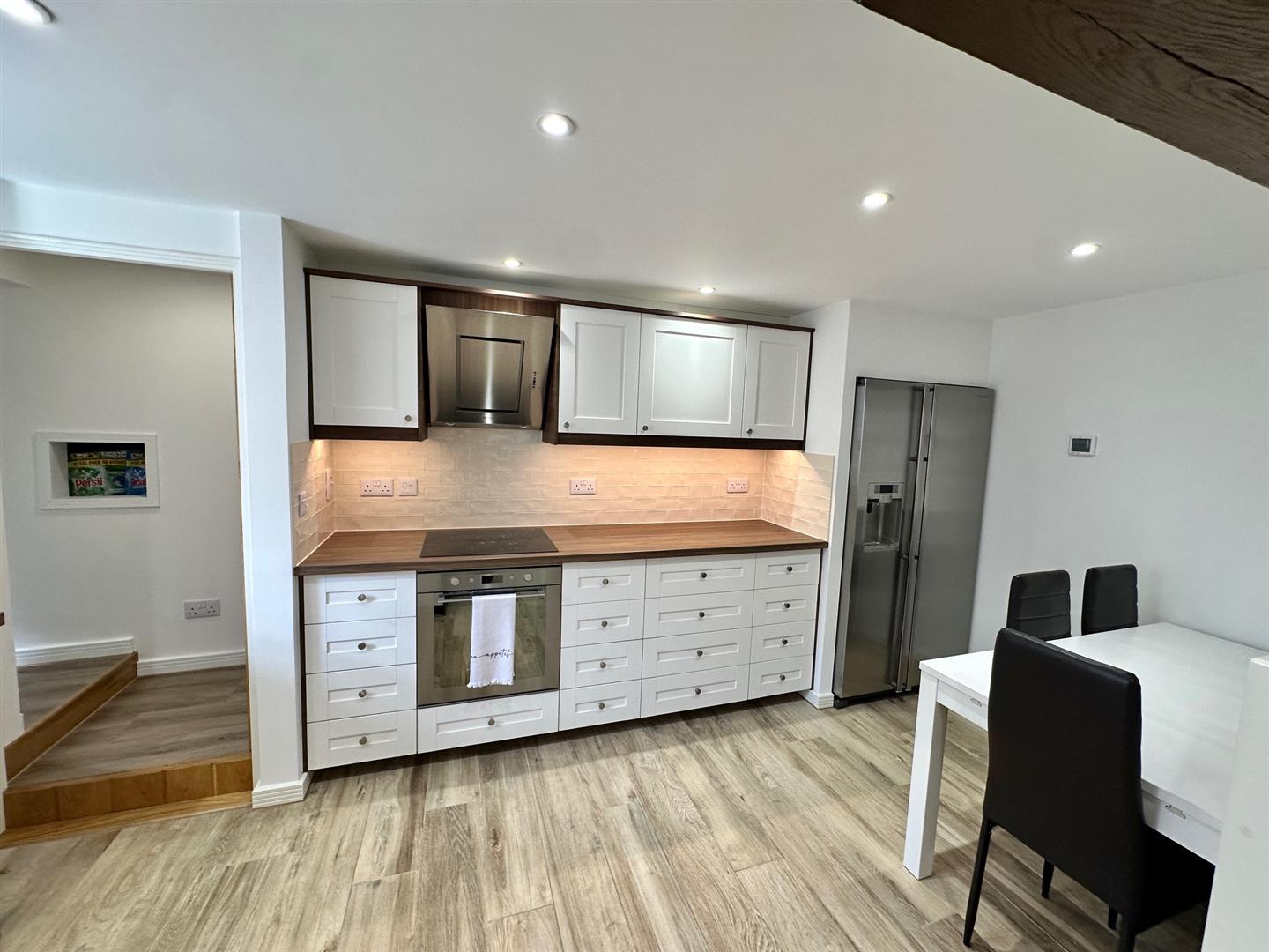 Open plan kitchen / lounge / diner with vinyl wood effect flooring & recessed lighting. Range of high and low shaker kitchen units in white with walnut trims, wooden work surfaces, tiled splash backs, integrated oven with hobs & extractor over, integrated microwave & standalone dishwasher. Plumbed for washing machine & dryer. Plumbing for American fridge / freezer. Frosted window from kitchen overlooking garden. Lounge window overlooking courtyard. The under stairs storage cupboard is also plumbed for a washing machine.