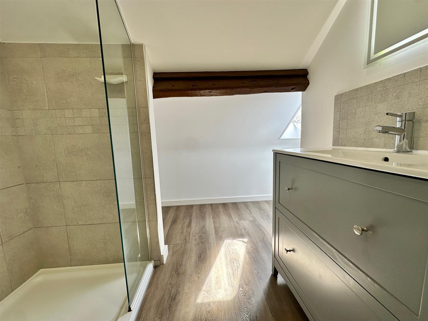 Shower with enclosure, wash hand basin with cupboards below & heated mirror above. Vinyl wood effect flooring, recessed lighting & roof light.