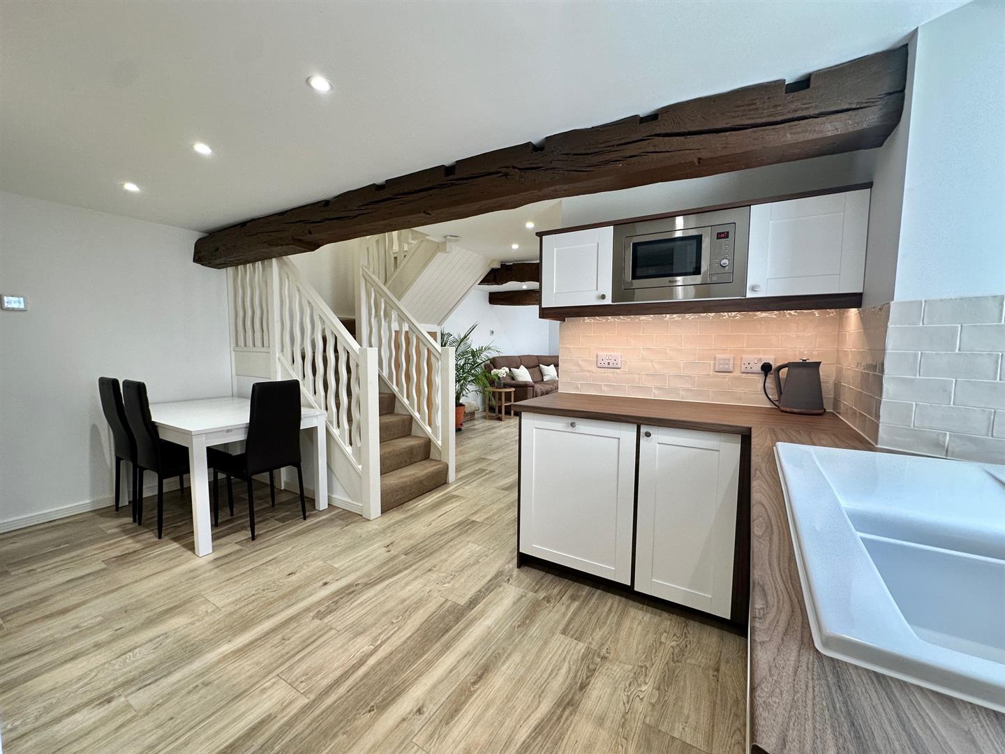 Great sized open plan living and entertaining area with original feature wooden beams, porcelain wood effect flooring, plantation shutters to windows throughout, carpeted stairs to first floor & LED recessed lighting.